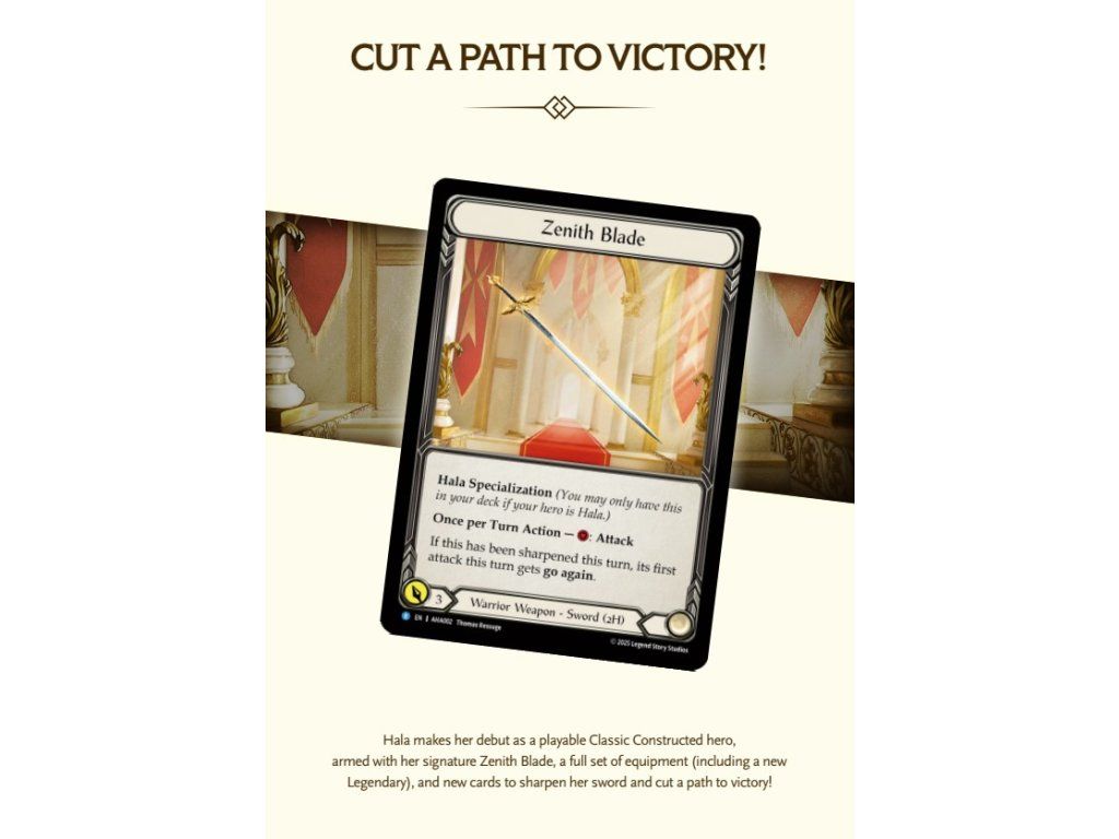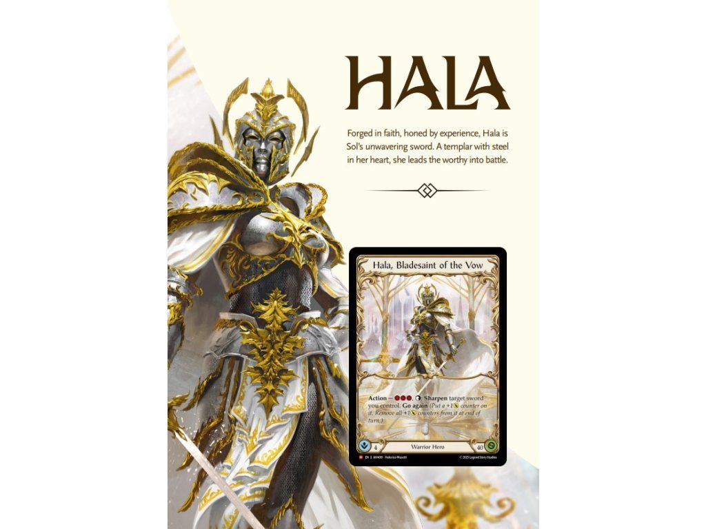 Armory Deck Origins: Hala přináší do hry jednu z výrazných postav světa Flesh and Blood vůbec poprvé jako hratelného hrdinu. Hala je zkušená šermířka, veteránka z bojiště a mentorka Dorinthey, která si své místo vydobyla disciplínou, vírou a léty praxe.