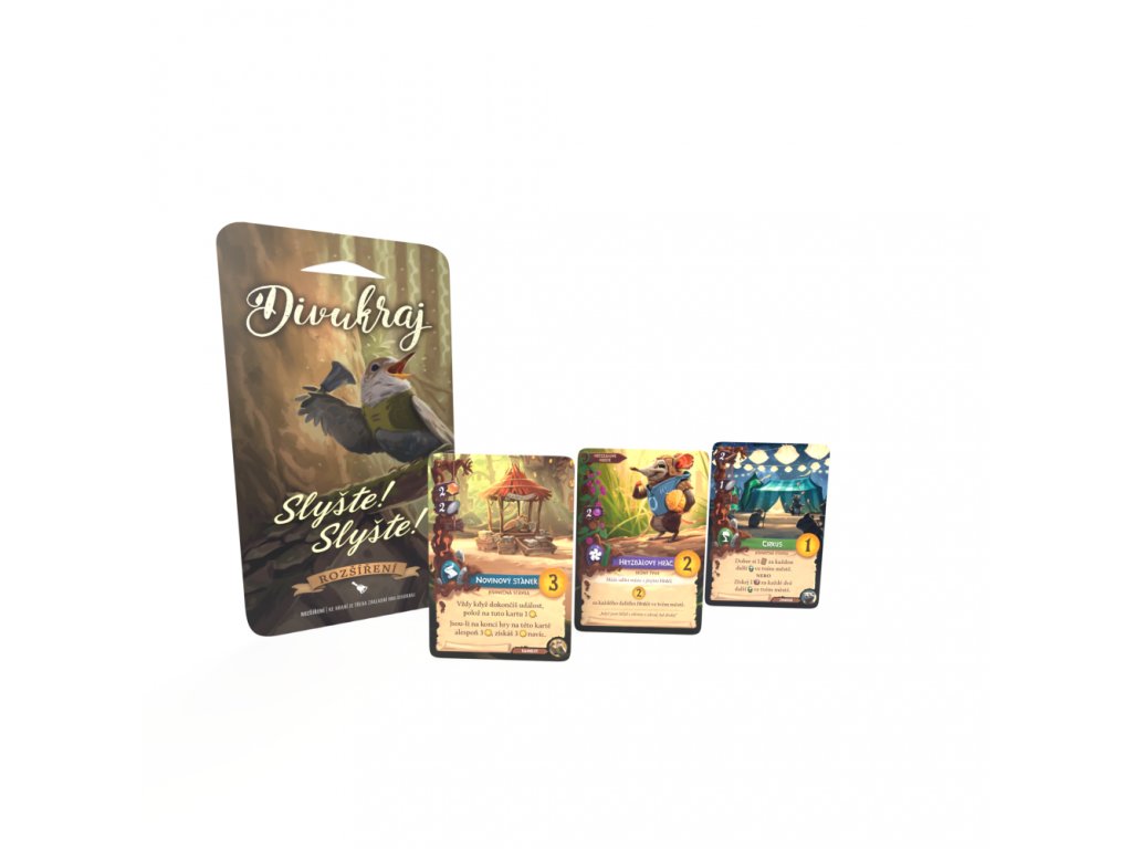 Divukraj: Slyšte! Slyšte! je malé rozšíření, které přináší do vaší oblíbené hry 15 nových karet. Čekají na vás nové postavy, stavby i události, které opět rozvíří poklidné vody (a stromy) Divukraje. Připravte se na nové kombinace, nečekané tahy a další kousky, které obohatí vaše partie.