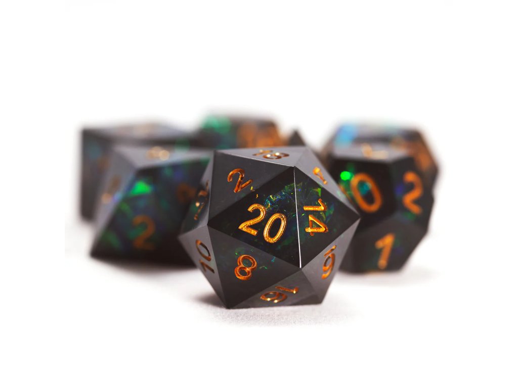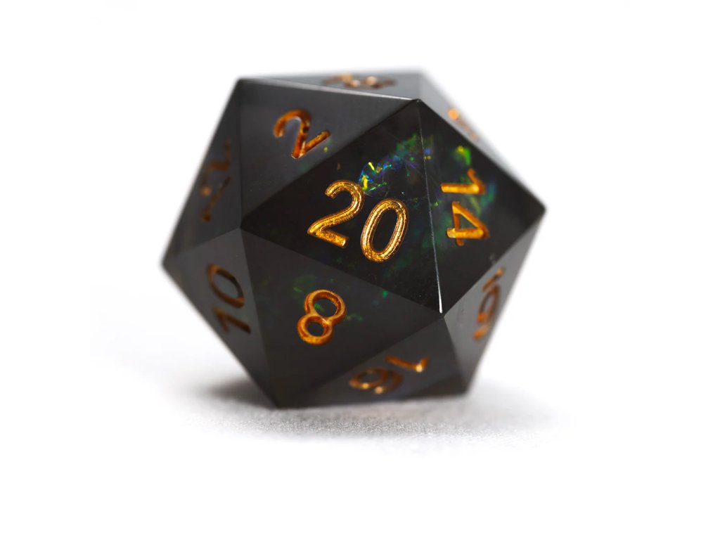 Tyto průsvitné kostky z černé pryskyřice jsou posypané třpytkami a doplněné duhovou fólií, která vám při každém hodu připomene, že magie je vždy nablízku.